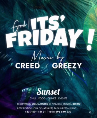 Sunset CHILL, FOOD . DRINKS . EVENTS RÉSERVATION OBLIGATOIRE ET VALABLE JUSQU'À 22h00 RÉSERVATION (VIA WHATSAPP) TAPAS/RESTAURANT : +33 7 60 11 31 31 | +596 696 540 530