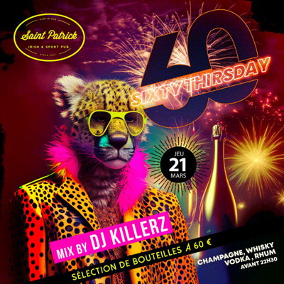 LES BOUTEILLES SONT A 60euros APRÈS LE MAXIMUS ET LE DRINK’S L'’INCONTOURNABLE SIXTY THURSDAY revient Ce Jeudi 21 mars au Saint Patrick ! Ça s'passe comme ça tous les JEUDIS !! La folie s'empare du dancefloor!! Aux platines Qui de mieux que Dj KILLERZ L’abus d’alcool est dangereux pour la santé . Arrive tôt on ferme à minuit . On est là dès 19 h 00 . #SIXTYTHURSDAY #SAINPATRICK