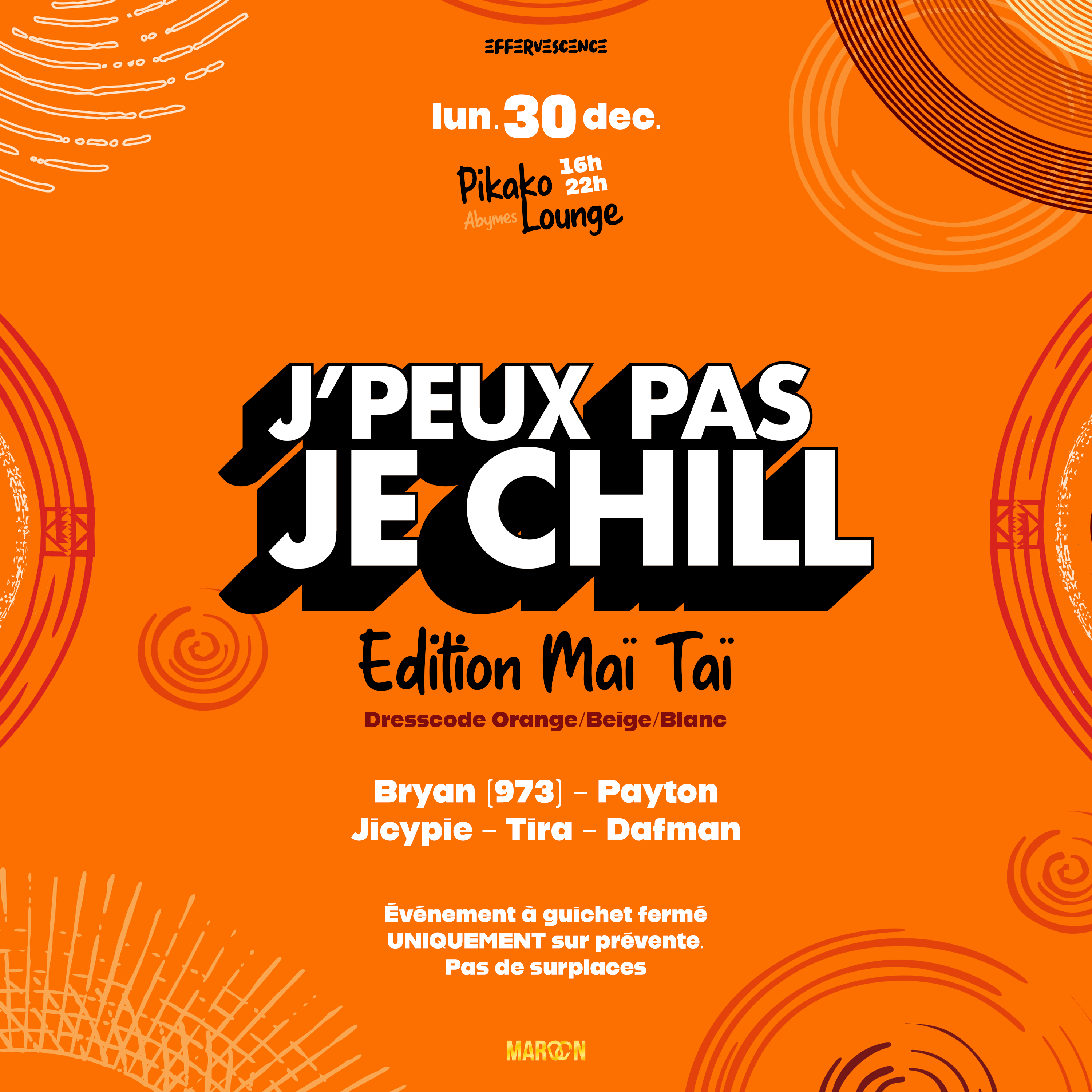 J’PEUX PAS JE CHILL – ÉDITION MAI TAI Le samedi 30 décembre, termine l’année en beauté avec une garden party unique ! Rendez-vous au Pikako, aux Abymes, de 16h à 22h, pour une ambiance où fête et détente se rencontrent. AU PROGRAMME : Un voyage musical pour vous faire vibrer Des cocktails exclusifs grâce à notre partenaire MAROON qui sublimeront chaque moment. Une atmosphère chic et conviviale, parfaite pour faire la fête ou juste chiller autour d’un verre. DRESS CODE : Orange, beige ou bla...