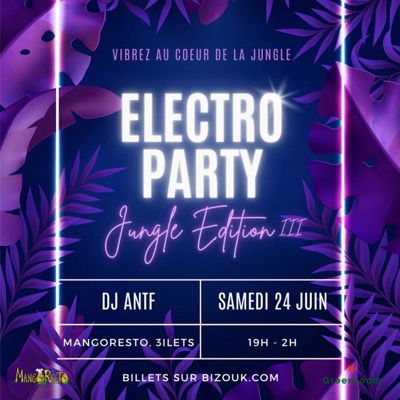 Vibrez au coeur de la fôret pour la troisième édition de la Jungle Electro Party ! Vous avez adoré la première, vous avez adoré la deuxième, vous allez adorer la troisième ! On se retrouve le Samedi 24 Juin 2023 à Mangoresto aux 3Ilets pour revivre une expérience hors du temps et de l'espace ! INFOS PRATIQUES DJ Antf Music Samedi 24 Juin 2023 Mangoresto, Site de Mangofil, Forêt Rateau, Trois Ilets 19h - 2h Grand parking sur place Entrée Jungle : 10€ (entrée simple) Entrée Wild : ...