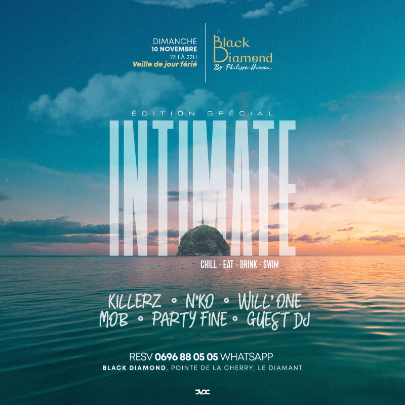 INTIMATE - Act II Dimanche 10 novembre, veille de jour férié retrouve nous pour une nouvelle édition « INTIMATE » autour de la piscine du Black Diamond. De 12H à 23H, plongeons dans une ambiance exclusive, rythmée par des sets tech & house de DJ Party Fine et Mob, ainsi que des vibes hip-hop et internationale de DJ Killerz N’ko et Will One. Une expérience musicale unique vous attend pour une journée en immersion totale. CHILL~EAT~DRINK Résa salon : 06.96.88.05.05 (whatsapp)