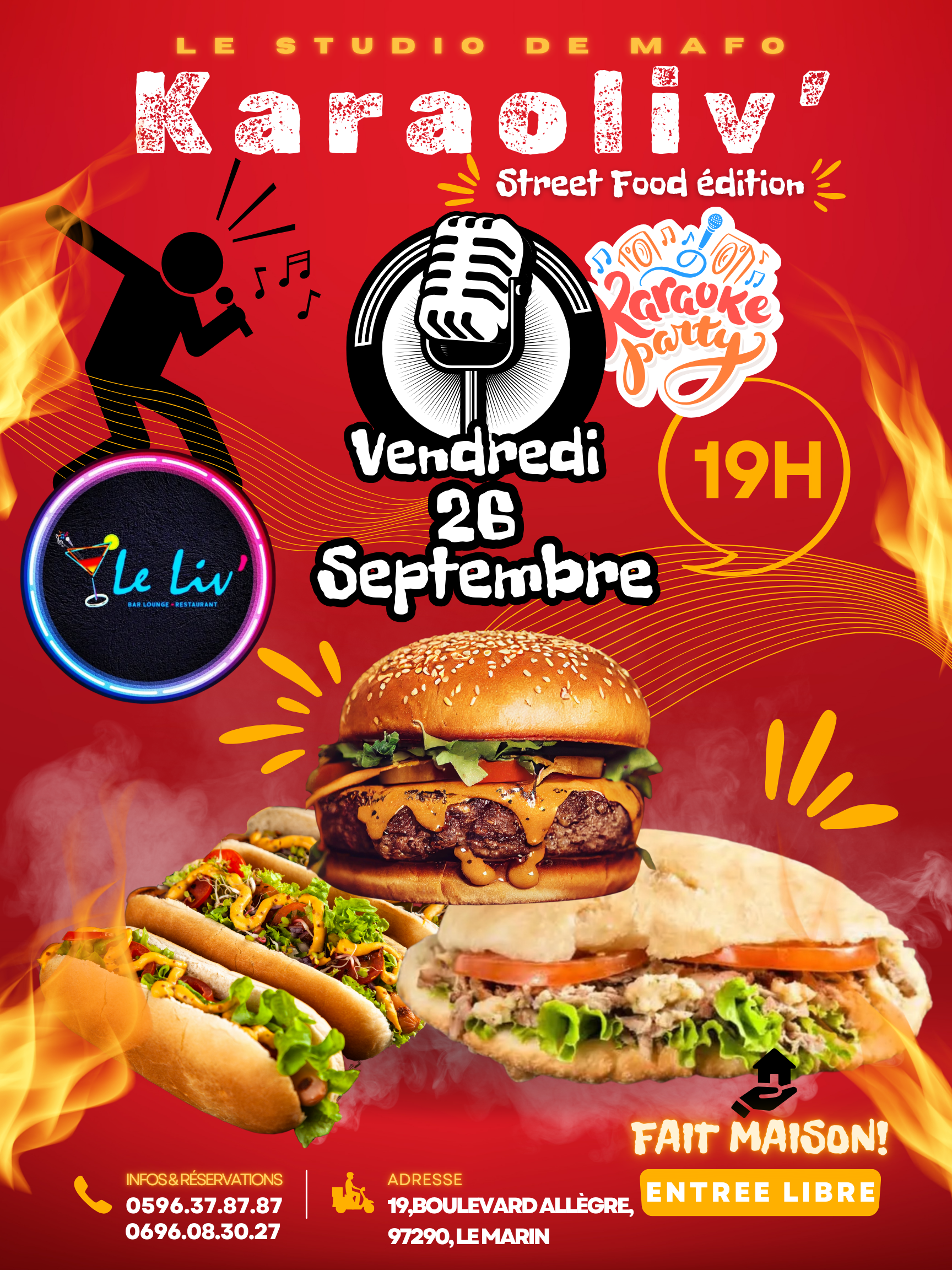 Vous avez kiffer??🥰😍😍 allez Goo... 🎤KARAOLIV'🎤 🌭🍔🍟🥙 *STREET FOOD ÉDITION* 🔥🔥 QUI A DIT QUE TU NE POUVAIS PAS ÊTRE UNE STAR!!!✨💫 Tu chantes et tu manges...elle est pas belle la vie??? *3 FORMULES*🤤🤤 * 1 streetfood * 2 streetfood * Tout tout tout dans l'assiette 🥵🥵 🗓️VENDREDI 26 SEPTEMBRE 2025 ⏰ DÈS 19HH 📍 LE LIV’BAR 👩🏾🎤《LE STUDIO DE MAFO》👩🏾🎤 On ne la présente plus son KARAOKÉ est incontournable... ✨VIENS ÊTRE LA STAR DE CETTE SOIRÉE💫 ☆🍹1 cocktail offert à...