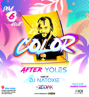 La COLOR AFTER YOLES Ton Dimanche très coloré (dress code) et mouvementé avec Dj NATOXIE 19h00 - 00h00 Récupère ton invitation valable jusqu'à 21h30 : Accès strictement interdit aux mineurs, contre de pièce d'identité obligatoire. Le ZODIAK Bar Centre commercial la Véranda, à Cluny, Fort de France. Info/Résa VIP 06 96 051 531 (Seulement sur WhatsApp)