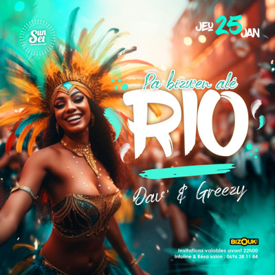 Pa bizwen ale RIO ici’a sé kraché difé… Rien a ajouter! Mettez un peu de couleurs dans vos tenues et pourquoi pas une touche de déguisement . En Mode Brazillllll plumes paillettes ou autres … enclenchons ce carnaval comme il se doit . Recupere Ton invitation ( places limitées) Et à jeudi. Possibilites de se restaurer ou grignoter .