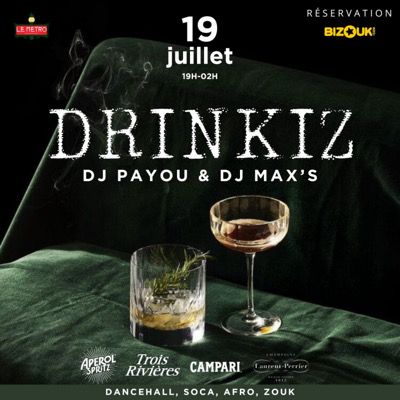 DRINKIZ* Hello les Drinkers DRINKIZ SUMMERS ce *Vendredi 19 Juillet* dès *19h*, au Métro. La fin de l’ambiance ne déprendra que de vous ! *I’m Drinkiz & You* Entres collègues, amis, couples… *Dj PAYOU* *DJ MAX’S* HAPPY HOUR cocktails de 19h à 22h. A partir de 20h, enjaillement, défoulement jusqu'à épuisement. Drinkizment Votre! Foods, Cocktails signatures, Champagnes & Hards. INVITATION VALABLE JUSQU'À 22H https://www.instagram.com/drinkiz.afterwork?igsh=MTl0N3cwcGVxZGZ2OQ=...