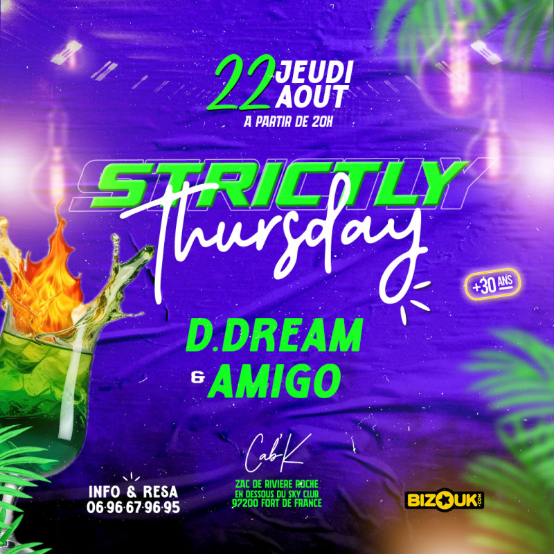 STRICTLY THURSDAY SAISON 2 On ne s’en lasse pas ! Le jeudi est à nous ! Même adresse pour TOUJOURS plus d’ambiance ! La base aux - moins de 30 ans (certains diront que c’est un plan de vieux mais on est bien plus jeunes qu’eux ) CAB’K à FORT-DE-FRANCE mix by KLYNE & KILLERZ Rdv dès 20h, le jeudi est à nous Evènement sur INVITATION valable jusqu'à 22h après 10€ Tapas & Drinks Possibilité de réserver des salons INFOLINE : 0696679695