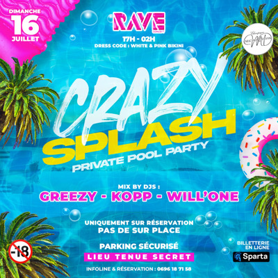 Inédit en 🌴*MARTINIQUE*🌴 La *RAVE* concept débarque ! 🌊 Un concept *privé*, dans un cadre unique autour d'une piscine 💦 Pour une Pool Party 🫦 *Chic & Crazy* 🫦 Welcome to the 🔥💦 *Crazy Splash* 💦🔥 Le Dimanche *16* Juillet De *17h* à *2H* Mix by Djs : *GREEZY* - *KOPP* - *Will'one* Dress Code : *White ⚪ & Pink 🫦 Bikini* Événement *privé* uniquement sur réservation : - Sur liste *gratuite* (Limitée) au : *0696 18 71 58*/+33 6 21 02 30 04 - Puis 15€ Disponible sur la plate-forme *Sp...