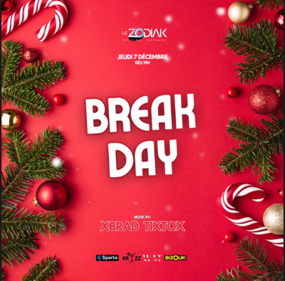 Le “Break Day” autrement dis le jour de pause ! ⏸️ **Édition un NOËL shatta **🎅🎁 Ton rendez-vous incontournable du jeudi 7 Décembre. Dès 19H. 🗓️ 🚨Un shoot offert avant 22h🚨 Pour te mettre bien 🎶 DJ XBRAD 🥳 DJ TIXTOX 🥳 Vous réserve une prestation de Qualité ✅. Billeterie sur bizouk et Sparta uniquement. 🎟️ Lieu : Le Zodiak au centre commercial la Véranda à Cluny. 📍 Une soirée spéciale pleine de surprises pour recharger vos batteries après une journée bien re...