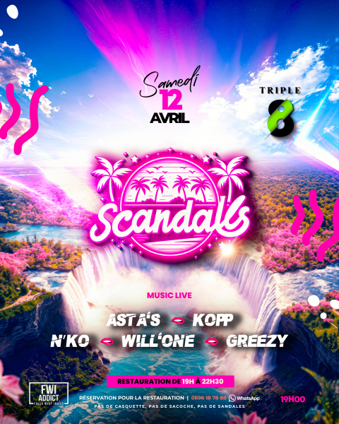 SCANDALSAu Triple 8 – Samedi 12 Avril 2025 Préparez-vous pour une nuit hors du commun… la SCANDALS débarque au Triple 8 pour une soirée qui s’annonce incandescente ! Dîner : 19h - 22h (0696187888 par Whatsapp) Soirée : à partir de 22h Aux platines, une line-up explosive : Kopp – Asta’S – Will One – N’Ko – Greezy Dress code : Une touche de rose – Osez le détail qui fera la différence ! Ambiance Shatta, rythmes envoûtants et une atmosphère où tout peut arriver… Êtes-vous prêt à succomber au SCAND...