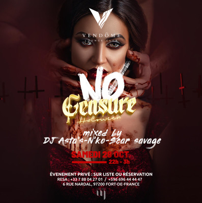 đNO CENSUREđ Edition HALLOWEEN Rejoignez-nous ce Samedi 28 octobre pour la 7eme Ă©ditions de la NO CENSURE đ¶LâĂ©vĂ©nement sera animĂ© par deux DJ de la Martinique, Dj NâKO & Dj ASTAâS đ đ„Viens nous retrouver au VendĂŽme de 22h jusquâau bout de la nuit⊠pour une ambiance encore plus sensuelle et explosive. ĂvĂ©nement sur liste !!! â Pas sur liste = Pas dâentrĂ©e â đČ RĂ©serves ton salon VIP au : +33 7 88 04 27 01 / +596 696 44 44 47 Liste valable jusquâĂ 1h30 aprĂšs plus dâentrĂ©e !!! Co...