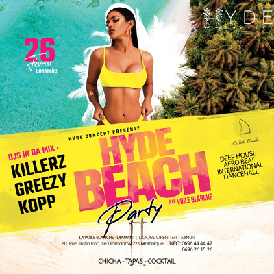 🏝La HYDE Beach Party 🌴 (😅Carnival Survivor édition😅) 🔰Ce Dimanche 26 Février à partir de 17h. ⛱Comme d’hab, on se donne rendez-vous à la _*Voile Blanche*_ en mode 🎶 Deep House, Afrobeat, international & Dancehall…🎶. 🎧Avec nos Famous Deejays🎤 -Killerz -Kopp -Greezy 🩳Dress code : Beach swag👙 📲Infos résa : 0696261526 / 0696444447 ⚠️Évent sur liste valable jusqu’à 19h. Ou récupère ton invitation ici 👈 🥙Des formules chichas & tapas seront disponibles.