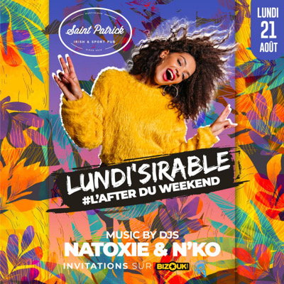 *TON DEBRIEFING AFTER WEEK END LE PLUS HOT* *LUNDI’SIRABLE* La vie est une Fête !!! Donc pas de repos Rejoins Nous Au *SAINT-PATRICK* Ce lundi 21 Août dès 19h30 Avec les indésirables *NATOXIE & N’KO* Récupère Vite Ton Invitation #Woulibb #LautoRoute #SansManman #SansPapa #MonteLeSon #LaSoupe #AvecOuSansEx
