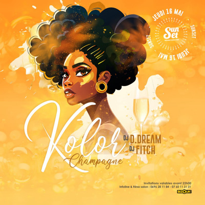 KOLOR champagne La couleur champagne est de mise ce jeudi 16 mai des 19h30 au Sunset Un peu de bulles dans les papilles n’est pas de trop , pour l’occasion une offre 1+1 sur le champagne Invitation et tickets dispos ici