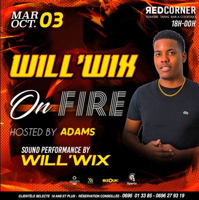 Ce MARDI dès 18h la *TEAM XS* et leurs *Hôtesses sexy* te convient au *REDCORNER* pour leur soirée WILL WIX On FIRE ! *Dj WILL WIX * mettront un Maximum d'ambiance en mode Shatta ARRIVEZ TÔT . *Réserve Ton Salon dès maintenant* MANU 0696.013385 _ La direction se réserve EXCLUSIVEMENT le droit d'entrée._