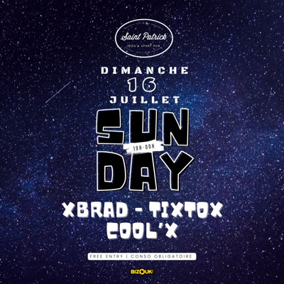 ``SUN DAY``` Les dimanches du Saint-Pat ! #TonRendezVousDuDimanche *DIMANCHE 16 JUILLET* Direction le SAINT-PATRICK, à partir de 19h ! ```On boit un verre, on prend du bon son, le reste viendra tout seul, simplement.``` Entrée libre, consommation obligatoire. L’équipe de la Triple X sortie de France pour vous servir ! "DJ X-BRAD - TIXTOX - COOL’X" ARRIVEZ TÔT !
