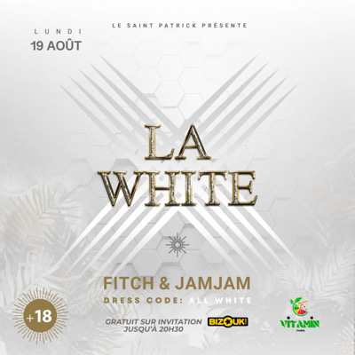 La White La White c'est le plus gros concept de l'île tous les lundis au saint Patrick. DJ FITCH & JAMJAM Dress code : Tout en blanc EVENEMENT INTERDIT AU MINEUR Ouvert dès 19h