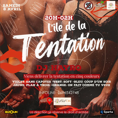 _MADA ÉVÉNEMENTIEL_présente Le retour de *L’ILE DE LA TENTATION* Le seul moyen de se délivrer de la tentation ? C’est d’y céder tu porteras le bracelet de la couleur qui te conviendra, qui mangera qui? DJ Hayro Thème PS:il faut obligatoirement assumer Tenue sexy pour les femmes Et pour les mecs chic *Alors viens délivrée la tentation en cinq couleurs*: violet sans capote vert : juste du soft bleu : ce soir et c’est tout jaune : Plan à 3 orange : on fait comme tu veux De 20h à 02 h...