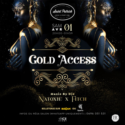 Ce SAM 01 AVR, ⚜️ GOLD ACCESS ⚜️ Music by Djs 💎 NATOXIE & FITCH 💎 ~ HAPPY HOUR JUSQU'À 21H30 ~ 🍷 1 Verre de Vin offert pour vous Mesdames ✨🫵🏾 Ou sur l'application SPARTA : 📲 0696 051 531 - 0696 281 184 (Seulement sur WhatsApp)