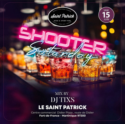 !! CE SAMEDI 15 juin !! SHOOTER SATURDAY Carte exclusive à 2 EUROS SUR TOUTES LES PRÉPARATIONS DE SHOOTERS MAISON ! Avec pour chauffer encore plus tout cela @djtixs972 ! pour un set épicé ! Ouvert dès 19 h 00 . Cc Didier Plaza ; Route De Didier . FdF - +596696194006 L'abus d'alcool est dangereux pour la santé à consommer avec modération . tous les shooters à 2 euros jusqu à 22 h 30