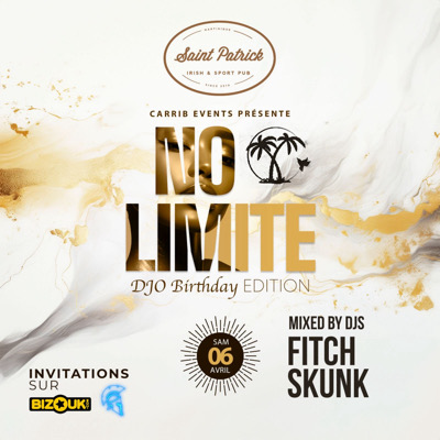 NO LIMIT Nous te donnons rendez-vous le : SAM 06 AVRIL 2024 *Au Saint-Patrick* Pour une soirée d’exception organisée par @carrib_events Aux platines : DJ FITCH & DJ SKUNK Gratuit sur invitation BIZOUK avant 22H00 !* Infos & réservations de salon au : 0696 77 96 18 (WhatsApp) Ouvert dès 20h Cc Didier Plaza ; Route de Didier, Fdf ARRIVEZ TÔT ! PLACES LIMITÉES !! *Tenue correcte & esprit correct exigés *La direction se réserve le droit d’entrée