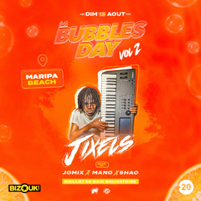 Vous avez été nombreux à la réclamer ! Et elle fait son grand retour cet été La bubbles day revient le Dimanche 13 août de 14h-20h Au Maripa Beach Aux platines : Dj Shao - Dj Jomix - Dj Mano Et pour finir un show exceptionnel du jeûne artiste Jixels ! Munies toi de ton plus beau maillot et de tes plus beaux accessoires Rappel : Maillot de bain obligatoire Objets interdits : Baskets - Jeans - Substances illicites - Objets de valeur - Armes