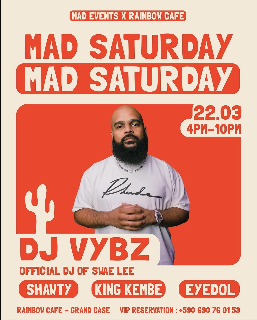 MAD SATURDAY avec DJ VYBZ au Rainbow Café ! Pour la première fois à Saint-Martin, DJ VYBZ, le DJ officiel de SWAE LEE, débarque au Rainbow Café pour une soirée inédite signée MAD EVENTS ! Habitué à enflammer les plus grandes scènes aux États-Unis et da