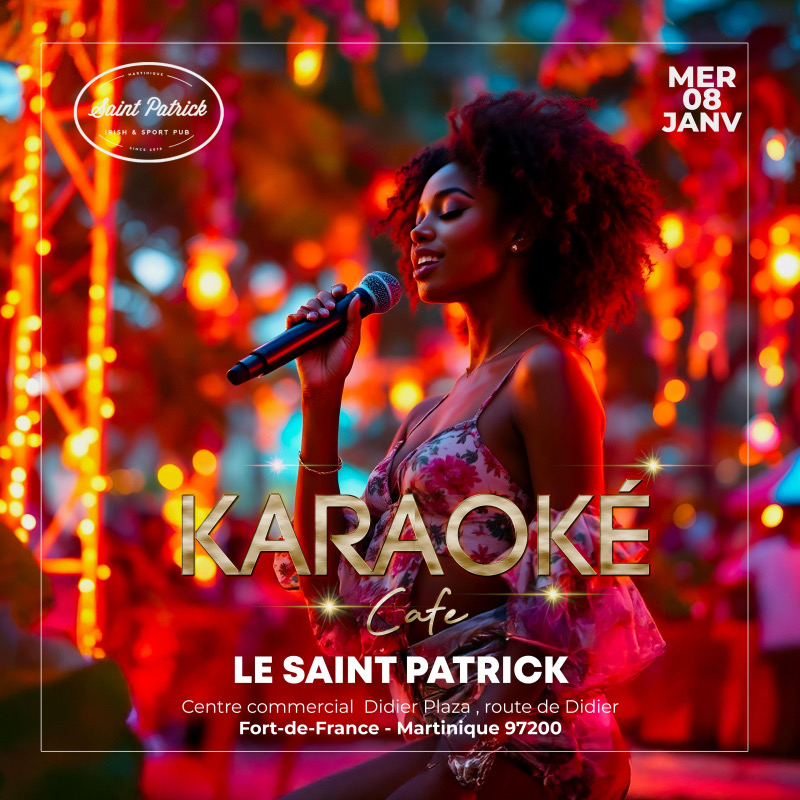 Rejoignez-nous pour une nuit de karaoké pleine de fun, de musique et de bonnes vibes ! Venez chanter vos hits préférés, seul ou avec vos amis. Le karaoké démarre à 19h00, arrivez tôt. Entrée libre Rejoignez-nous au Saint-Patrick, au centre commercial Didier Plaza à Fort-de-France. Pour plus d’infos, appelez le 0696863950
