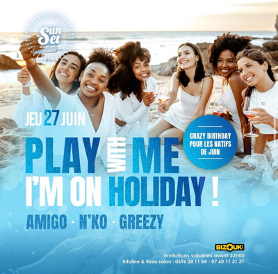 Hello ! Le rendez-vous est pris tous les derniers jeudi du mois, on fête les natifs!!! *Les gémeaux et les cancers* seront à l'honneur: Ce JEUDI 27 juin au *Sunset* !! DJ AMIGO N'KO & GREEZY pour vous servir Bienvenue à l'edition de la PLAY WITH ME* *I'm on Holiday* BIZOUK https://www.bizouk.com/events/details/play-with-me-im-on-holidays/81691 Bien entendu que serait un anniversaire sans cadeau ? _Pour l'occasion une offre sur le champagne vous est proposée avant 22h30_ *1+1=1* Alors Tous les na...