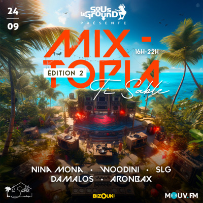 *MIXTOPIA* Une zone éphémère, les pieds dans le sable, le soleil sur la peau et du bon, du bon, du très bon son dans les oreilles. La musique sera de nouveau le Bwa lélé d'un cocktail festif et détonant où se mélangeront, échangeront, partageront les DJs et leur public de *16h à 22h*. Aux platines : *DAMALOS*_(Amapiano) *NINA MONA* (AfroBeats) *ARON BAX* _(Deep House) *WOODINI* _(Kreyol House) -*SoUsLeGrOunD* ...