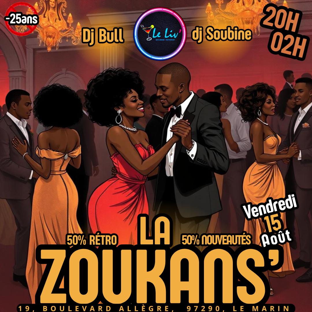 🗣️📢À la *Demande générale* on *Pull.Up*⚠️ Avec ou sans partenaire et parce que *Sé sel Médikaman nou ni*... Si on ZOUKAIS??? ✨ *LA ZOUKANS’*💫 Act 4 🗓️ VENDREDI 15 AOÛT 2025 ⏰ 20H - 02H 📍LE LIV’ BAR 🎧 DJ BULL & DJ SOUBINE 🔞 - 25 ANS ⚠️TENUE ET ESPRIT CORRECTE EXIGÉ ❌INTERDIT : SANDALES, SHORT, JOGGING❌ ENTRÉE GRATUITE/CONSOMMATION OBLIGATOIRE (PLACES LIMITÉES) 📲 0596378787 / 0696083027 📍19,BOULEVARD ALLÈGRE, 97290, LE MARIN