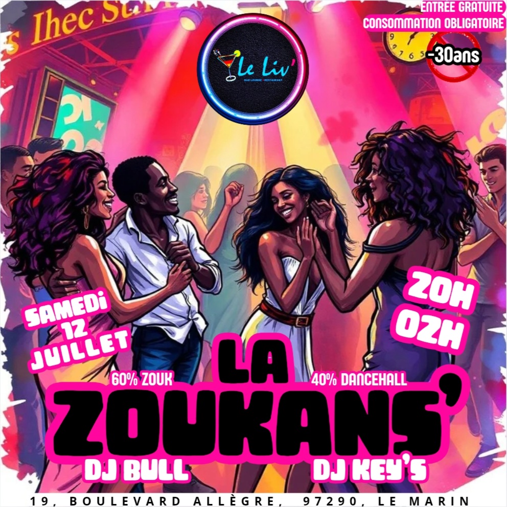Avec ou sans partenaire et parce que *Sé sel Médikaman nou ni*... Si on ZOUKAIS??? 🕺🏾 *LA ZOUKANS’* 💃🏾 🗓️ SAMEDI 12 JUILLET 2025 ⏰ 20H - 02H 📍LE LIV’ BAR 🎧 DJ BULL x DJ KEY’S 🔞 - 30 ans ENTRÉE GRATUITE/CONSOMMATION OBLIGATOIRE 📲 0596378787 / 0696083027 📍19,BOULEVARD ALLÈGRE, 97290, LE MARIN
