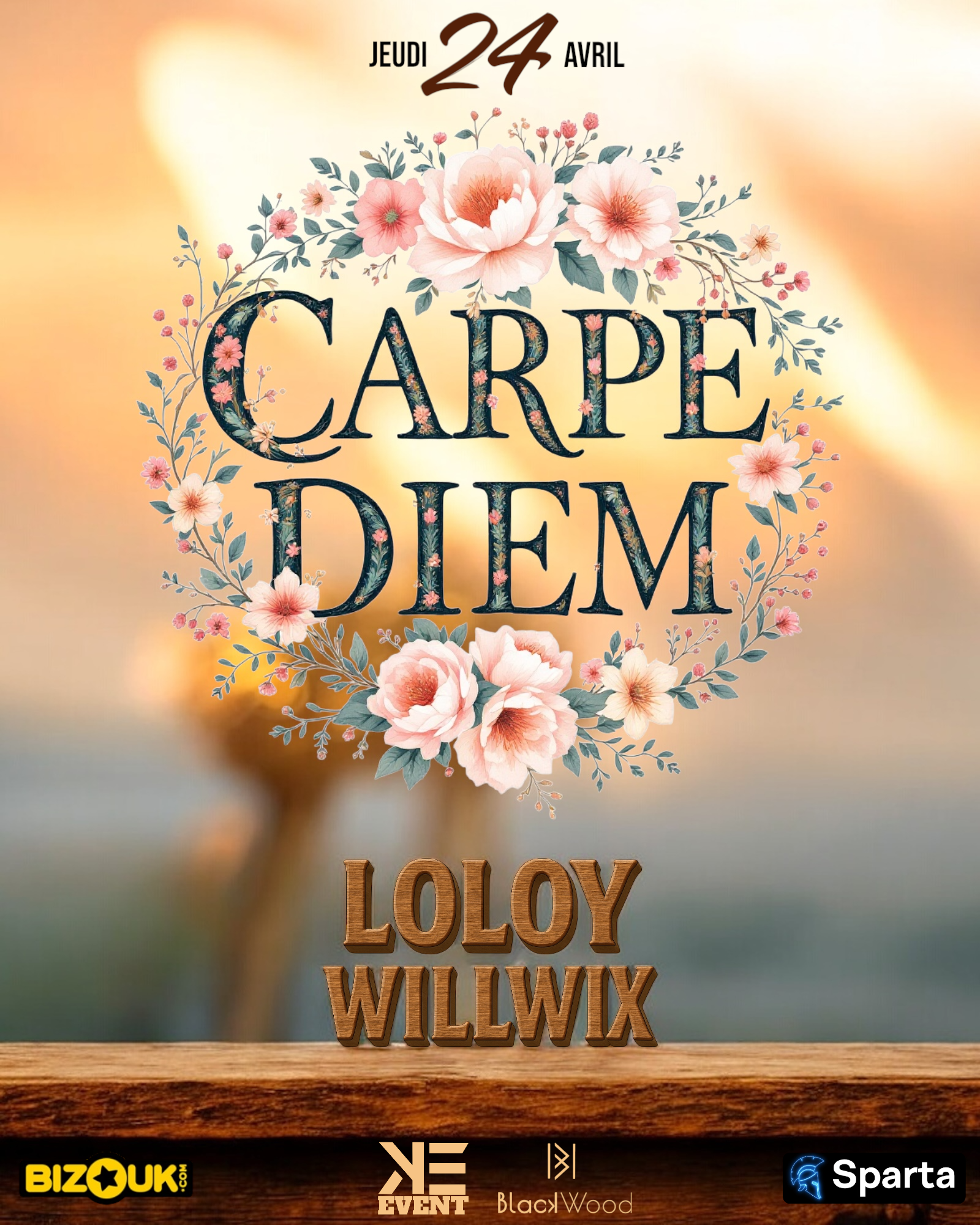 La Carpe Diem Ton rendez-vous du JEUDI 24 AVRIL « Cueille le jour présent sans te soucier du lendemain » Et si le temps d’une soirée plus rien ne comptait. Oublie tous tes soucis et vient savourer l’instant au BLACKWOOD avec au platine: LOLOY WILLWIX tenue et esprit correct exigé EVENEMENT INTERDIT AUX MINEURS