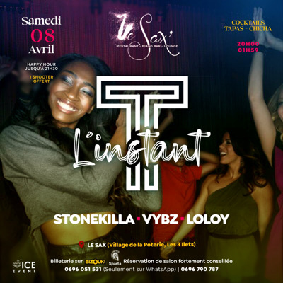 Rejoins le cercle de L'instant T... L'aventure continue avec la même philosophie 06h00 de bonne musique, de good vibes, l'instant d'un pur moment de détente avec STONEKILLA - VYBZ - LOLOY Clientèle multigénérationelle Happy Hour jusqu'à 21h30 1 CAÏPI ACHETÉE = 1 OFFERTE 0696 051 531 - 0696 790 787 (Seulement sur WhatsApp)