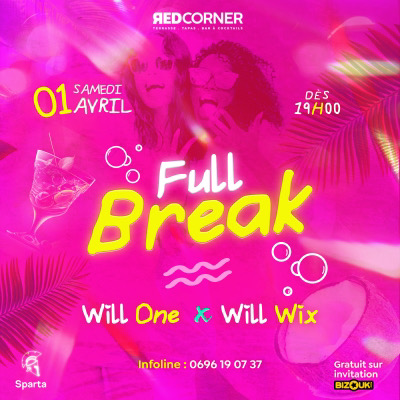 🌞 La *FULL BREAK* t’ouvre ses portes ce samedi 1er Avril au REDCORNER 😍 *WILL ONE & WILL WIX* sont là pour te faire kiffé ton week-end dès 19H 🥵 Récupère vite ton invitation sur bizouk ✅ INFOLINE : 0696 19 07 37