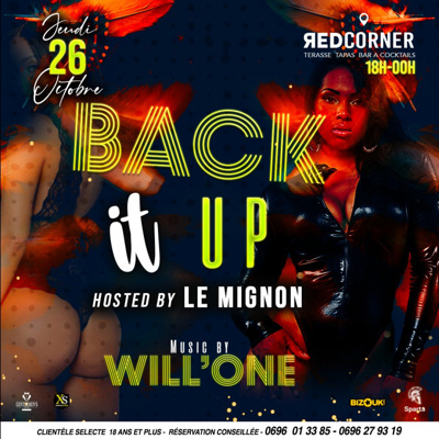 Ce *JEUDI* de 19h à MINUIT BACK IT UP avec Dj JAMJAM , & FRIENDS Hosted by LE MIGNON et la TEAM XS On t'attend au REDCORNER pour une soirée EXCEPTIONNELLE. Consommation Obligatoire Réserve Ton Salon VIP dès maintenant 0696.013385
