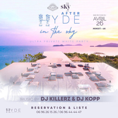✨✨_*HYDE IN THE SKY*_✨✨ « Ultra Private Whithe Party » On se retrouve ce Mercredi 26 Avril _Au Sky Club pour *l’after party*_ 💫Pour une Hyde la tête dans les étoiles de Minuit au bout de la nuit( 00h -4h), laisse toi enjailler par nos Deejays dans un univers très cosmopolite💫 On va vous passer de tout……🎼🎼 🎧_*Dj Killerz x Dj Kopp*_ aux platines. Pas de dress code imposé mais une petite touche « White» ce serait pas mal du tout😅🥳.