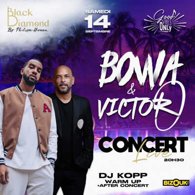 C’est au Black Diamond que BOWA et Victor O fusionneront leurs univers pour une soirée musicale exceptionnelle. Entre les rythmes caribéens de Victor O et la pop électro de BOWA, ce concert promet une expérience vibrante et unique. Warm up et After concert avec DJ KOPP Rdv le Samedi 14 Septembre à partir de 19H30 au Black Diamond Venez vibrer au rythme d’une fusion inédite et réservez votre place dès maintenant! Restauration sur place. #concert #kreyolpop #electropop #caribeanmusic