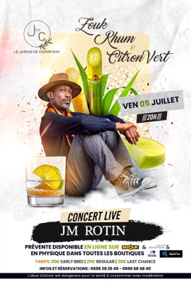 Nous avons l'immense plaisir de vous inviter à l'édition Gold du concept *Zouk, Rhum et Citron vert. Et cette fois, nous avons l'honneur d'accueillir l’un des meilleurs : *Jean-Michel Rotin* ! Rendez-vous le 5 juillet en plein air dans le Jardin de Champigny à Ducos dès 20h. Le lieu sera décoré pour l’occasion afin que le dépaysement soit total – vous pourriez presque jurer avoir vu une palmeraie pousser en une nuit ! *Au programme :* - *Concert live* de Jean-Michel Rotin, qui interprétera en...