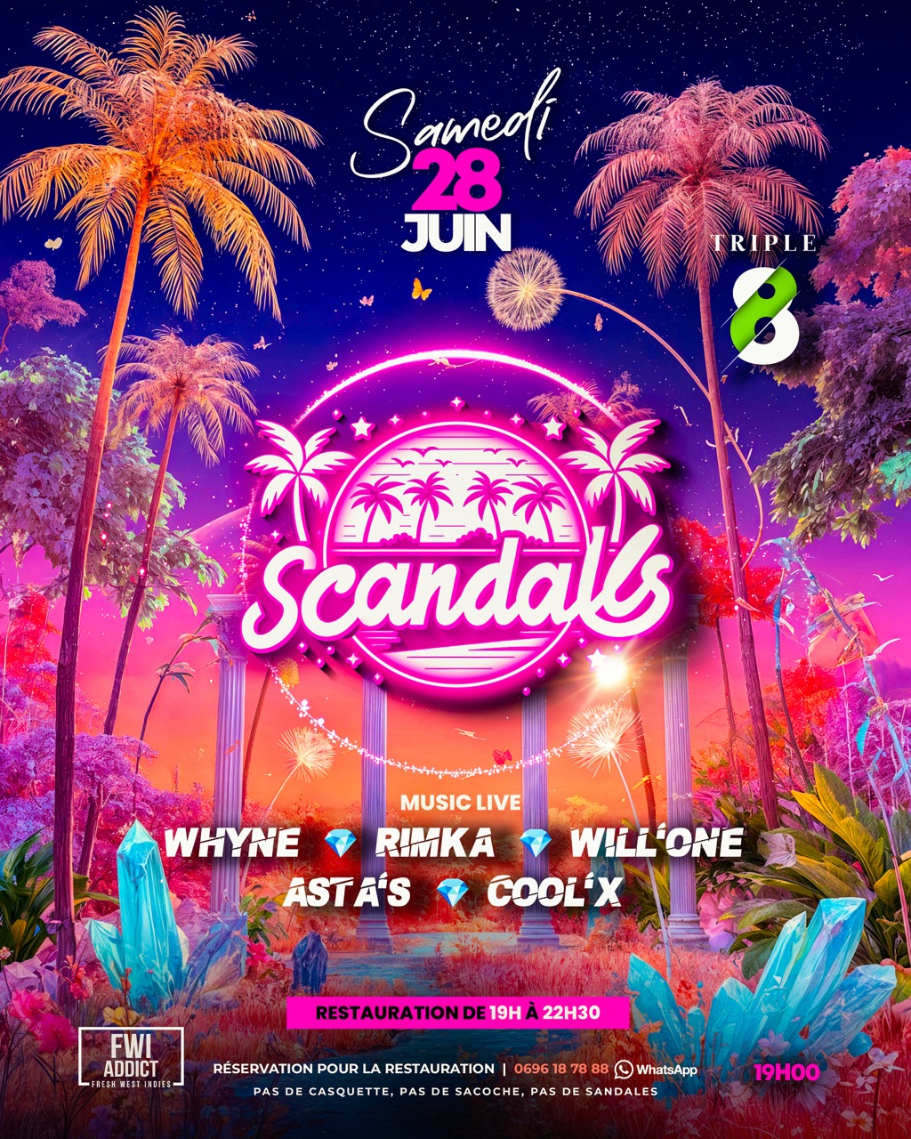 ☄️SCANDALS🌪️ « Open Holidays » 📍Au TRIPLE 8 – Ce Samedi 7 Juin 2025 💥 Préparez-vous pour une nuit hors du commun… la SCANDALS est déjà de retour au Triple 8 pour une soirée qui s’annonce incandescente ! 🥗Dîner à partir de 19h 🔥 Soirée : à partir de 22h00 Aux platines, une line-up explosive : 🎧Whyne- Rimka - Will One - Asta’S - Cool’X Dress code : Une touche de rose – Osez le détail qui fera la différence ! 🔥Ambiance Shatta, rythmes envoûtants et une atmosphère où tout peut arriver…...