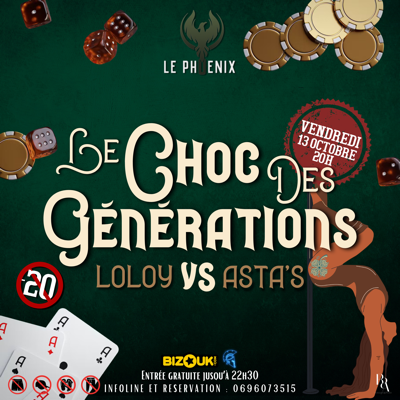 Vendredi 13 Octobre à partir de 20h, jeT'attend au *📍 Phœnix * pour le choc des générations avec Dj Loloy DJ Asta’s Tenue correcte exigée : Pas de casquette , pas de jogging , pas de sandales , pas de short Esprit correct recommander Entrée gratuite jusqu’à 22h30