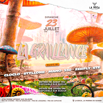DIMANCHE 23 JUILLET 17H/23H LA GRAILLANCE - TOUS LES DIMANCHES L’équipe EFFERVESCENCE te donne rdv pour un concept exclusivement réservé aux moins de 18 ans. LA GRAILLANCE c’est LA PLUS GROSSE SOIRÉE DES MOINS DE 18 ANS. Le concept est simple : un gros plateau DJs et un artiste à chaque fois . Pour cette édition on sera a LA PLANTATION avec DJs 530 X MANO STYLL ONE X CLOCLO STE X ZERFLY SHOWCASE SURPRISE ENTRÉE 5€ AVANT 19H SUR PLACE SI IL EN RESTE 10€ APRÈS 19H ...