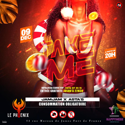 Samedi 9 Décembre à partir de 20h, pour le retour de la Take Me on T'attend au * Phœnix * pour une nouvelle soirée encore plus pressions avec Dj JamJam DJ Asta’s Tenue correcte exigée : Pas de casquette , pas de jogging , pas de sandales pas de et pas de short Esprit correct recommander Entrée gratuite jusqu’à 22h30 consommation obligatoire Arrivez tôt !!! Réserve Ton Salon VIP dès maintenant au 06 96 07 35 15