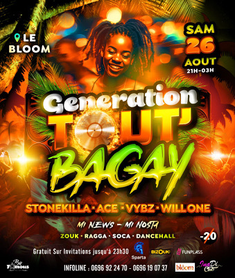 *GÉNÉRATION TOUT' BAGAY* (à la demande générale) 💃🏽Ambiance Mi Nosta - Mi News Zouk, Ragga, Soca, Dancehall 🕺🏽 *Le choc des Générations* 🗓️Samedi 26 Aout 2023 📍Le BLOOM 21h - 04h Ambiance assurée par : Dj Stonekilla Dj Will'One Dj Ace Dj Vybz 💶Paf : Invitations (limitées) valables pour tous avant 23h30 https://my.bizouk.com/generation-tout-bagay-1 Préventes : 15€ sur Bizouk.com 🚨 Strictement interdit aux moins de 20 ans ❌ 📱Infos : 0696 922470 / 0696 190737