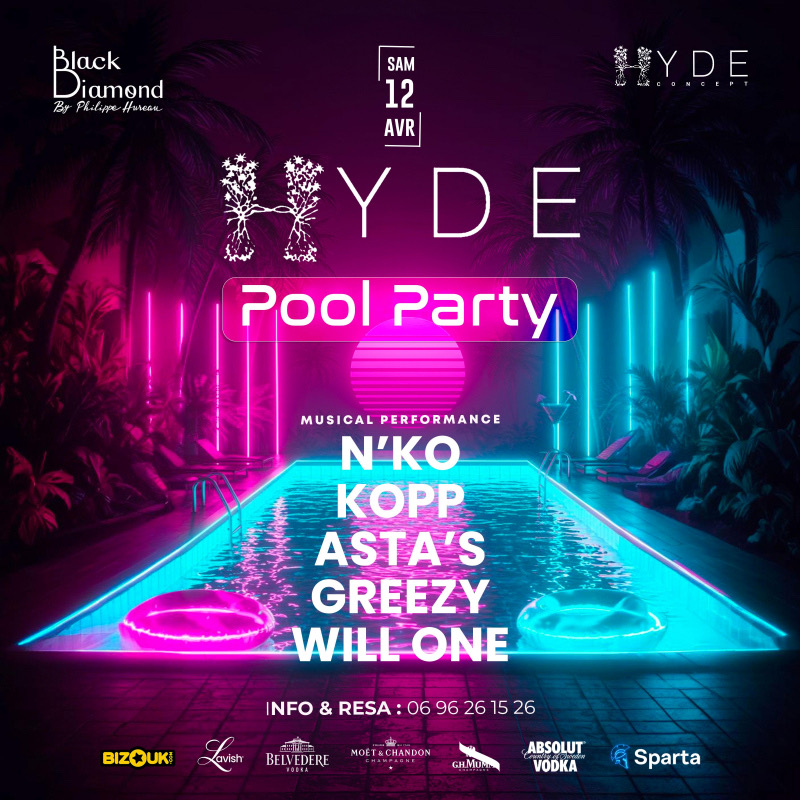HYDE POOL PARTY SAMEDI 12 AVRIL Le soleil, la piscine, des cocktails bien frais et un line-up de folie… La HYDE POOL PARTY débarque au Black Diamond ! BLACK DIAMOND 14H - 22H Renversement de maison by: Kopp - N’Ko - Will One - Greezy - Asta’s Good vibes only sous le soleil , des beats enivrants , des looks ultra-glam en maillot et des bulles à volonté