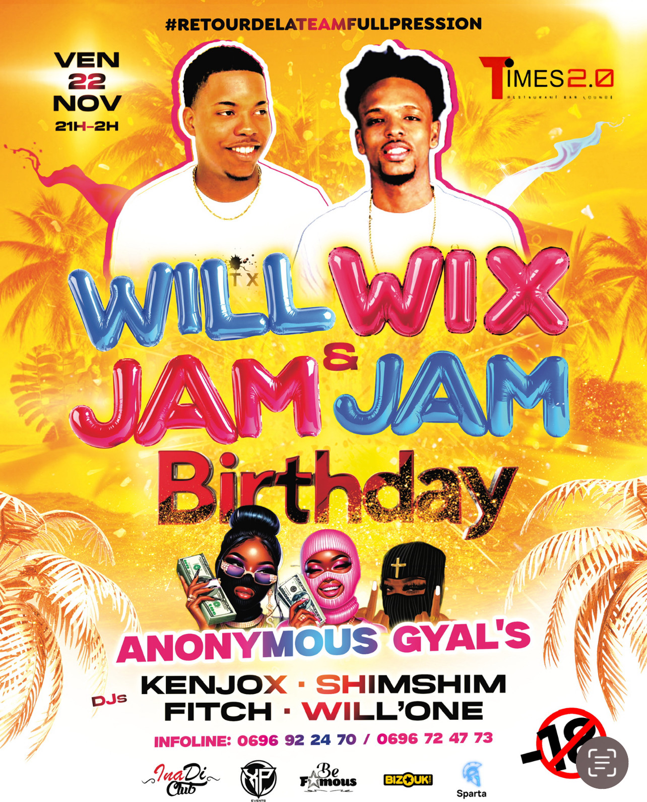 Helloooo La Team Full Pression 🌡️🔥 *WILWIX & JAMJAM BIRTHDAY* 🎂 📍Lieu tenu secret ( Secteur Sud) 📅 VEndredi 22 Novembre ⌚️21h/03h _Ne manquez pas l’occasion de participer au "bordel organisé" de la *TEAM FULL PRESSION* _🥳🎊 🚨🚊Pour rendre le moment inoubliable et en Totale Exclusivité : 🎙️ *LES ANONYMOUS GYAL'S*🌡️🔥🤯 Et pour les accompagner, nous avons fait appel aux experts en la matière : 🎧*WILLONE* 🎧*KENJOX* 🎧*SHIMSHIM* 🎧*FITCH* 🎟️ *INVITATIONS Bizouk valables jusqu'à ...