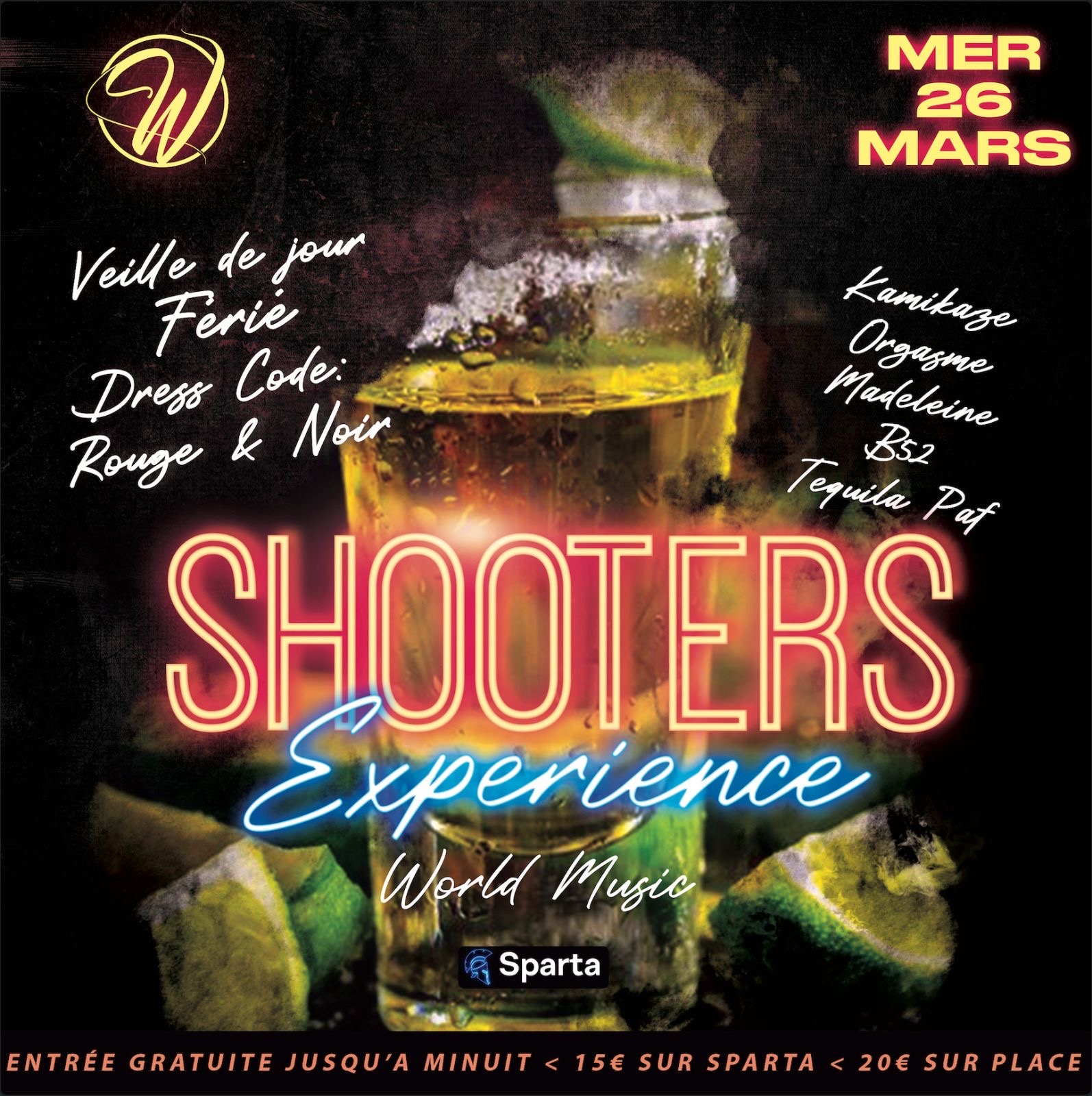 Toute l’équipe du W Club vous donne rendez-vous ce mercredi 26 mars pour la shooters expérience, l’entrée est gratuite pour tout le monde jusqu’à 0h15 € en prévente sur Sparta, valable jusqu’à 1h30 sur place 20 €