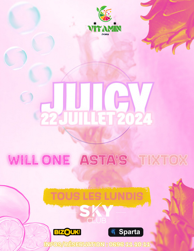 JUICY by VITAMIN ÉVENTS Prépare-toi pour une soirée mémorable tous les lundis au SKY CLUB ! Ce lundi 22 Juillet, viens vibrer au rythme de DJ TIXTOX, DJ WILLONE et DJ ASTA'S qui feront monter l'ambiance au Sky. Lieu : SKYCLUB MARTINIQUE Réservation Salons et informations au : 0696.11.10.11 **Billets disponibles sur BIZOUK & SPARTA:** Bizouk : https://my.bizouk.com/juicy-skyclub Sparta : https://spartaapp.page.link/s1RN DRESS CODE : TENUE CORRECTE OBLIGATOIRE ! Viens t'am...