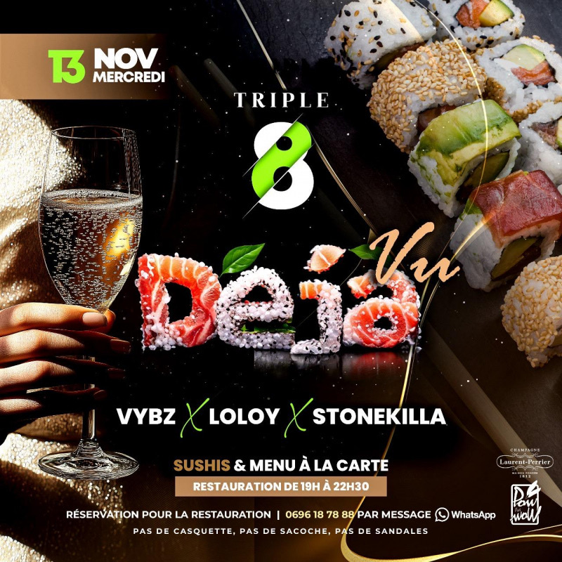 Viens t'exprimer avec tes amis... Sur le Spot qui se décline en Salons ou en Tapis dignes des Mille et une Nuits... pour l'occasion... La Team Ratchèt: Dj VYBZ, Dj STONEKILLA, et Dj LOLOY vont chauffer vos tables et salons. Les Tapas prémiums du Chef Youri ainsi que les Savoureux Sushis du Maître Sushi Valoom Spécialités du mercredi... Des Bulles m'acclament et me réclament ?!!... Déjà, je les déguste Les Duos Champagne : Laurent-Perrier, Jacquart, Collet Uniquement par Téléphone Infos Réserva...