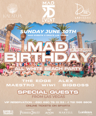 ✨3 Years anniversary At Kalatua Beach✨ MAD EVENTS x DRAIS LAS VEGAS 📍On Sunday, June 30th, Mad Events is celebrating the 3rd anniversary of its concept at Kalatua Beach in partnership with Drais Las Vegas. 💥KALATUA X MAD EVENTS x DRAIS LAS VEGAS 💥 For this exceptional date, Mad Events is teaming up with one of the most renowned clubs in the USA, located in Las Vegas. Being both a Beach Club and a nightclub, Drais hosts the biggest names in US Rap each week, such as Cardi B, Lil Wayne, Wiz ...