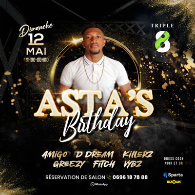 🎂 *ASTA’S BIRTHDAY* 🎂 📅*DIMANCHE 12 MAI* 🕰️ *19h/00h* 📍_*TRIPLE 8*_ 🎂À l'occasion de son Premier Anniversaire🎁, nous vous avons concoctés Un Line up de folie pour vous plonger dans l’univers musical de *DJ ASTA’S* avec des sonorités à l’ancienne et actuelles🎵💽 Ne manquez pas l'occasion unique de participer à cette ambiance hors du commun dans un lieu revisité spécialement pour l’occasion 🎉🎊 _Préparez-vous à faire un tour du monde musical avec les commandants de bord ✈️🌍_ 🎧*KILL...